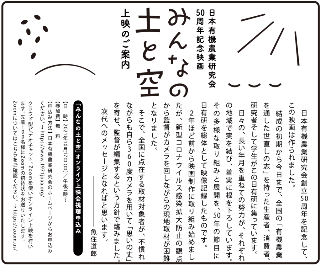 2021年10月17日(日)日本有機農業研究会創立50周年記念映画「みんなの土と空」のオンライン上映+試写が行われました。COVID-19という制限された状況のなかで、25件の取材先にGoproMAXという360度撮影できるカメラを宅急便で送り、そこで撮影された自撮り取材映像だけを使って作品をつくりあげました。以下、そんな話しです。